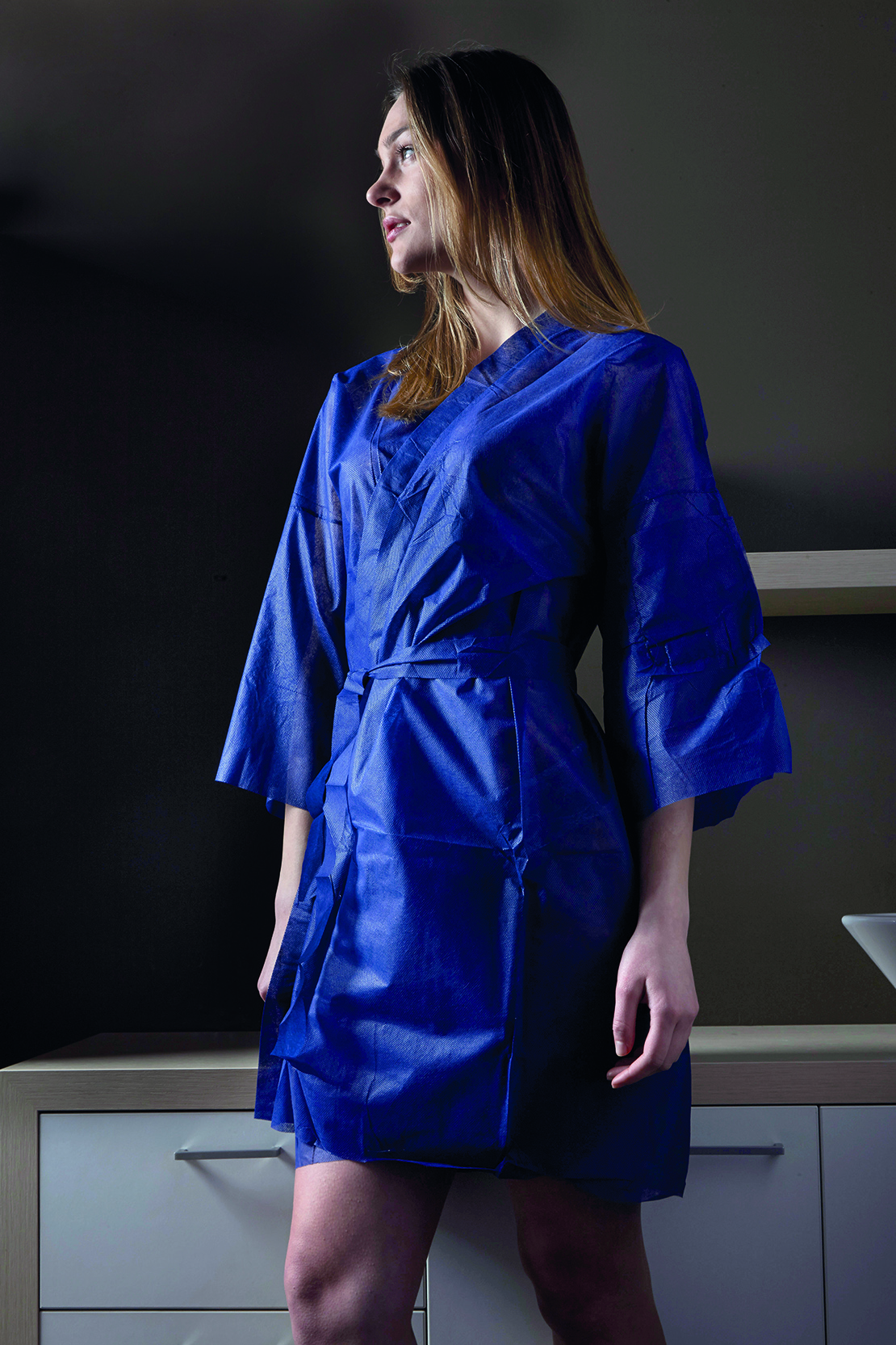 Κιμονό αισθητικής μιας χρήσης κατασκευάζετε από υλικό non wove 20gr σε χρώμα σκούρο μπλε. Διαθέτει μανίκι έως τον αγκώνα,ρέλι στο άνοιγμα V του λαιμού διπλή ζώνη στη μέση για να διευκολύνεται η προσαρμογή της και δύο τσέπες στο κάτω μέρος. Καλής εφαρμογής και ολικής οπίσθιας κάλυψης